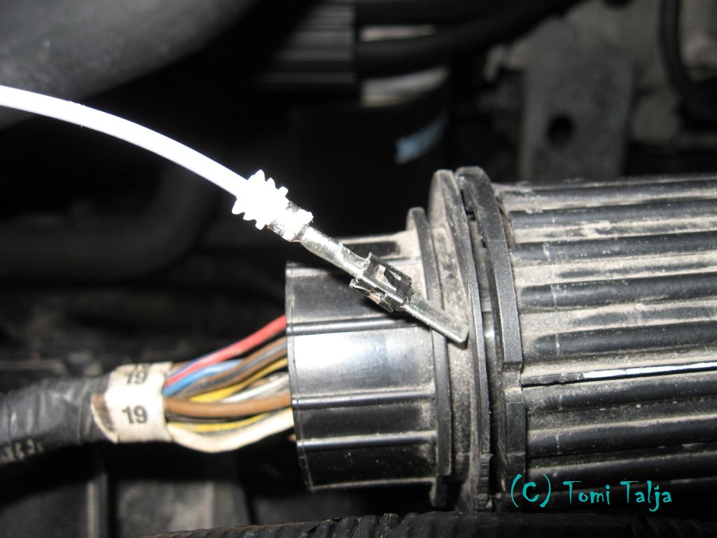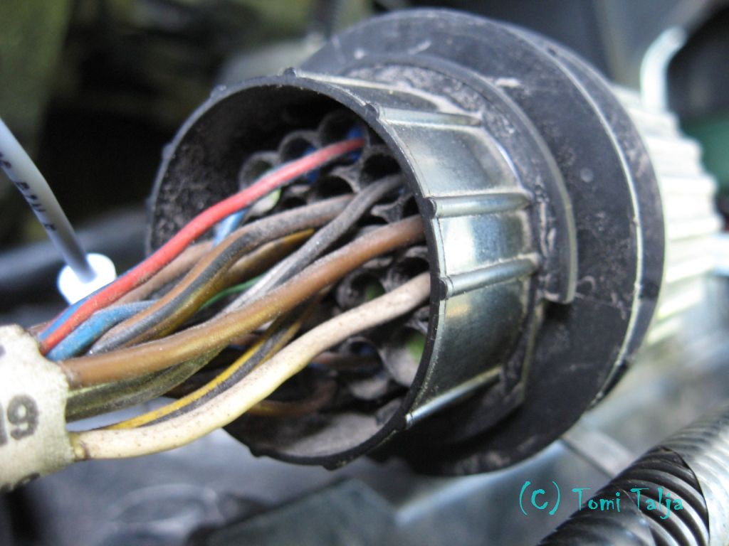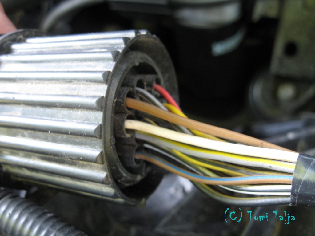 3) Etsi käsiisi johtonipusta harmaa johto keltaisella raidalla, tähän pitäisi tulla yli 12V jännite, kun kääntää sumuvalot päälle. Kannattaa varmistaa asia yleismittarilla. Etusumarit toimivat samalla releellä kuin takasumari, joten sitä ei tarvitse vaihtaa.