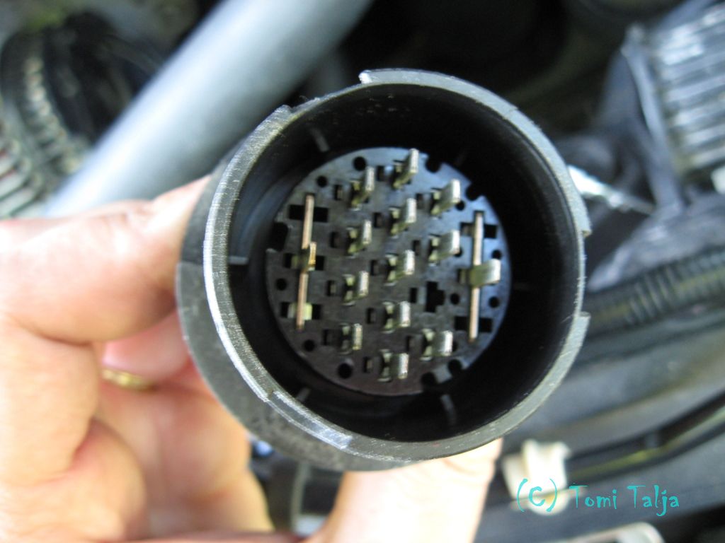 4) Vastapuolelta pitäisi löytyä tyhjä kolo, johon em. johto tulee. Tökkää reiästä tulppa pois ja asenna johtosarja tähän. Tämän jälkeen voit kiertää liittimen takaisin kiinni ja asentaa sen takaisin pidikkeeseensä. Vedä lisäksi johtosarjan johdot auton kiinnikkeitä hyväksikäyttäen sumuvalojen paikkojen taakse. Kiinnitä myös maajohto joko auton runkoon, tai akun miinusnavan kenkään. |
