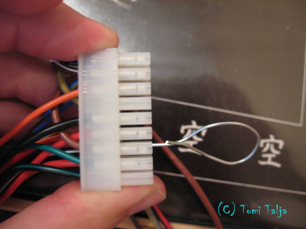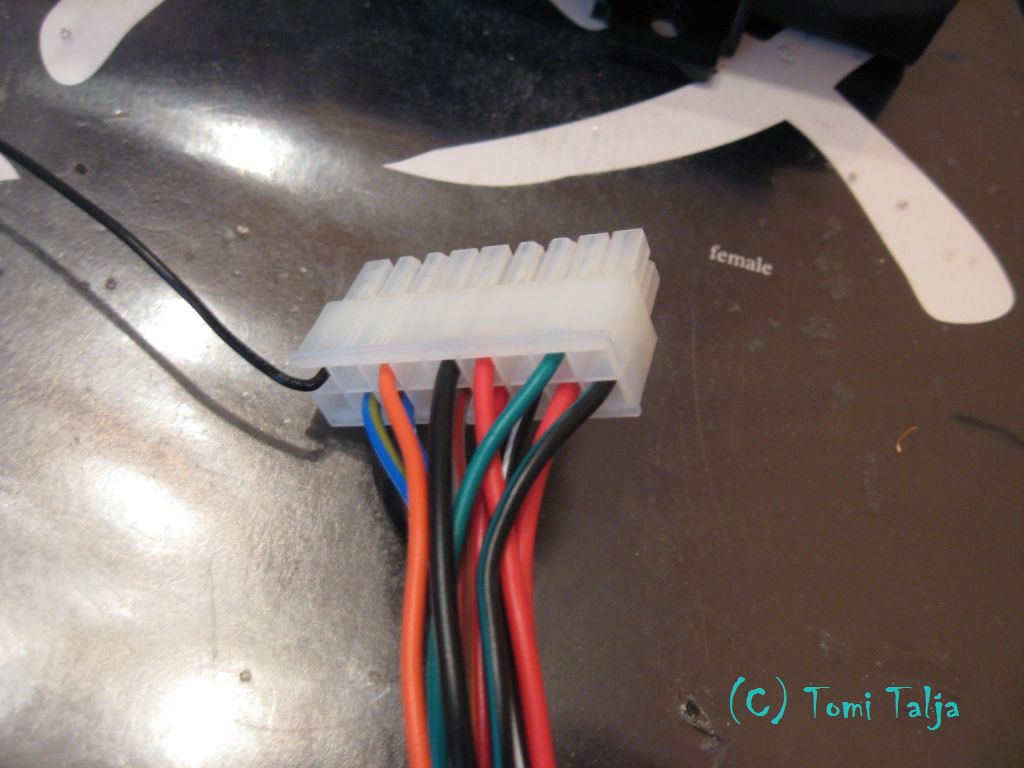 1) Paketista tullessaan laitteessa on mukana mielestäni kohtuullisen laaja johtosarja, jonka johdoista lähes puolet ovat turhia. Toisessa kuvassa vasemmanpuoleiset ovat tarvittavat johdot ja oikean puoleiset voi rautalangan avulla napsutella irti liitinrungosta. Liittimen molemissa kyljissä on liuskat, jotka langan avulla täytyy painaa liitintä vasten, jolloin se liukuu nätisti pois liitinrungosta. |